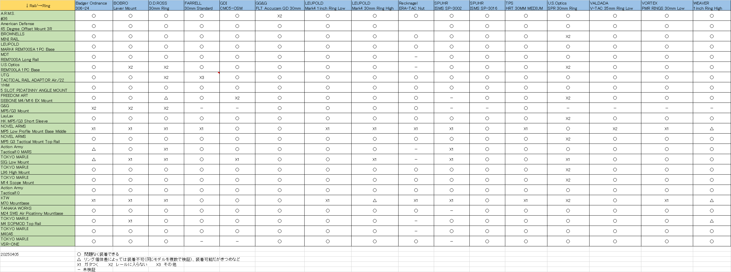 以下の表はどのレールにどのマウントリングが装着できたかを検証したものです。
